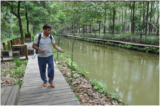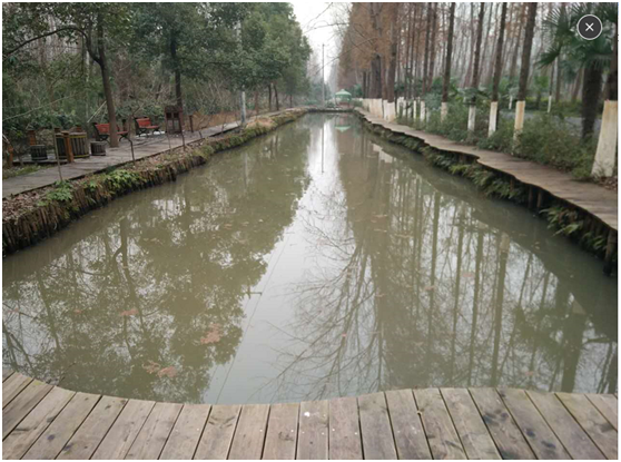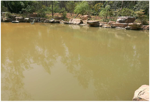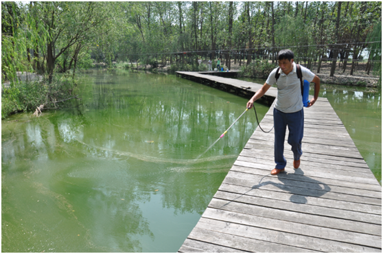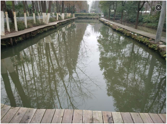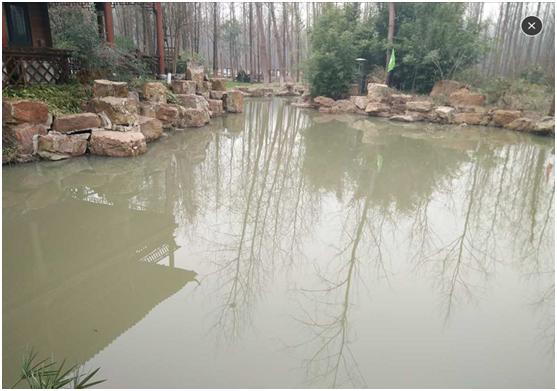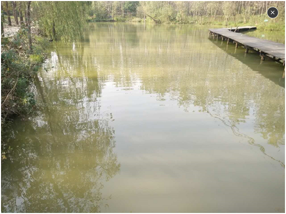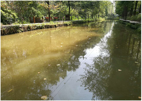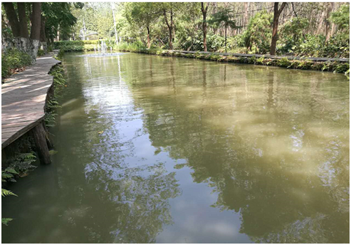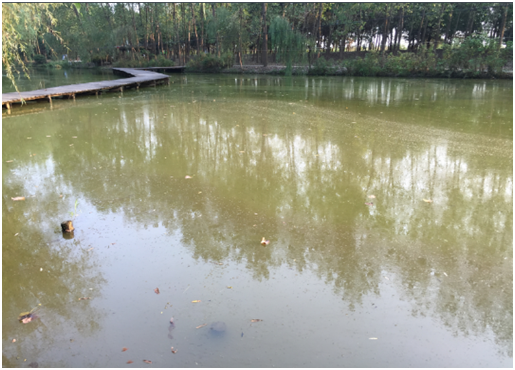1號(hào)水域:位于焦姥路北,翠隱洞天東,長(zhǎng)130米,均寬8米水域,面積1.62畝,1號(hào)水域相對(duì)獨(dú)立,補(bǔ)水由噴泉引地下水補(bǔ)充,水深1.5米,水體發(fā)黑,富營(yíng)養(yǎng)化嚴(yán)重,透明度低;2號(hào)水域:位于茗舍聽見附近,水域相對(duì)獨(dú)立,面積0.84畝,水深1.5米,水面飄浮厚厚的藻類水華,水生態(tài)嚴(yán)重缺失,水色呈黃色,補(bǔ)水由地下水補(bǔ)充;