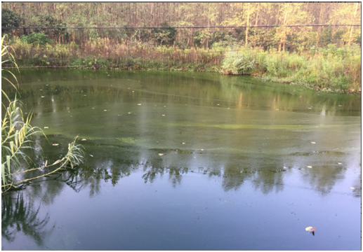 3號(hào)水域: 位于彩林站附近,水域與其他水域連通,水流量較小,水深1.5米,長(zhǎng)100米,均寬20米,面積9.94畝。污染嚴(yán)重,水生態(tài)缺失,水色呈深綠色,透明度極低,水面飄浮大量油狀水華物質(zhì)。
