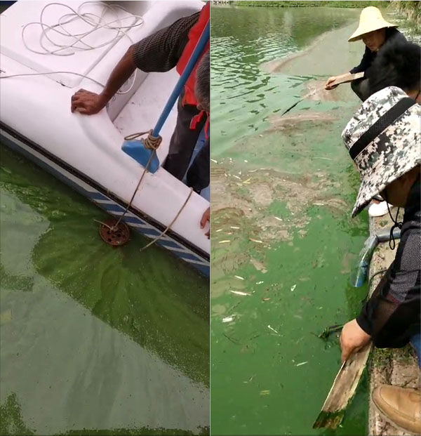 因段大院水塘水體封閉,死亡藍(lán)藻長時(shí)間積聚在水塘的下風(fēng)口,并自然腐敗分解,再次釋放出污染物質(zhì)進(jìn)入水體,因此自7月18日起連續(xù)10多天抽排死亡藍(lán)藻水華,減少水體污染源,從而加速效果。(僅抽排死亡后飄浮在水面上的藍(lán)藻水華,并非抽排段大院水體)。