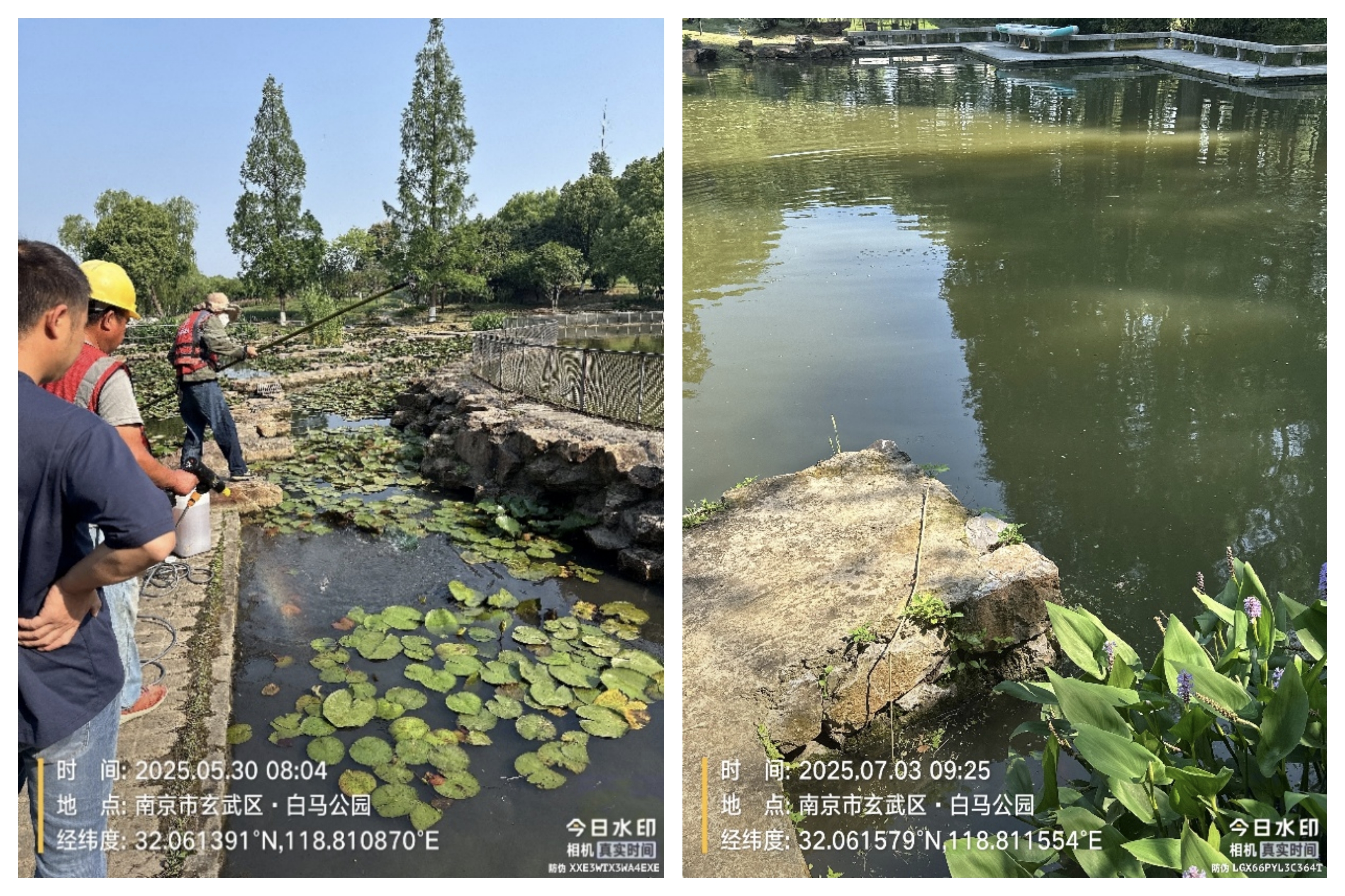 在鐘山風(fēng)景區(qū)的蔥蘢懷抱中,玄武區(qū)白馬公園的白馬湖曾悄然蒙塵。這片51.6畝的水域,由低洼水塘拓展而生,二十余載歲月里,流動(dòng)的韻律日漸遲滯,水華滋蔓,感官蒙翳,仿佛明珠失卻了靈動(dòng)光華。