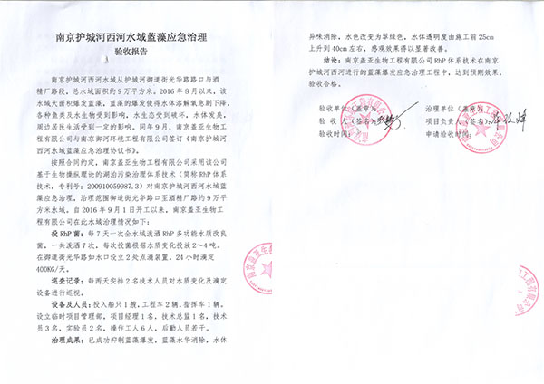 南京蓋亞生物工程有限公司運(yùn)用“基于生物操縱理論的湖 泊污染治理”專利技術(shù)(專利號(hào):200910059987.3),先后成功治理數(shù)百個(gè)大、中、小型湖泊、水庫、河道,積累了豐富的治理經(jīng)驗(yàn),并開創(chuàng)了目前國內(nèi)唯一成功在單體超過10平方公里水域進(jìn)行水污染治理防止藍(lán)藻暴發(fā)的經(jīng)典案例。該技術(shù)的核心是向污染水體定期投放經(jīng)靶向定位馴化獲取的RhP微生物工程菌株(RhP多功能水質(zhì)改良菌已通過中國疾病預(yù)防控制中心急毒試驗(yàn)、藻類生長抑制試驗(yàn),獲農(nóng)業(yè)部生產(chǎn)許可證,不含化學(xué)藥劑),RhP菌以目標(biāo)水域中的氮、磷、硫、碳等為營養(yǎng)進(jìn)行增殖,一方面切斷污染耐受力極強(qiáng)、魚類難以消化的藍(lán)藻的營養(yǎng)供給;另一方面,快速增殖的RhP菌作為浮游動(dòng)物的食物被消耗,浮游動(dòng)物又被魚、蝦、貝類吞食,從而修復(fù)和重建食物鏈,提高水體自凈能力,實(shí)現(xiàn)污染資源化。